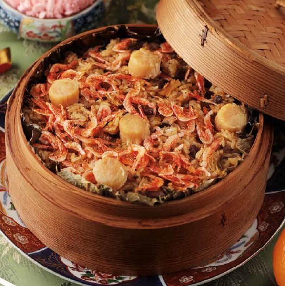 將主廚特製滷汁、豬肉絲、日曬蝦乾、乾的香菇等上選食材炒香後與糯米包裹於荷葉蒸炊,打開時有豐富的櫻花蝦、干貝、肉絲映入眼簾,濃郁的海味中透著荷葉淡雅的香氣,是一道兼具視覺、嗅覺及味覺的佳餚。