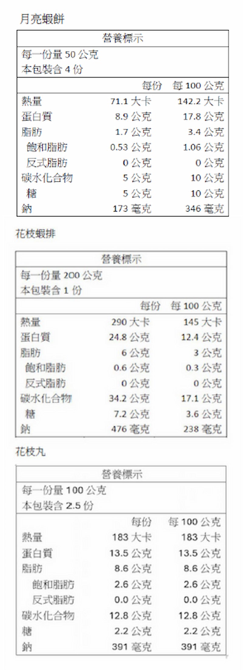 成分:花枝,蝦仁,澱粉,蛋白,糖,葡萄籽油,麵包粉,魚露,鹽,蒜粒粉,胡椒