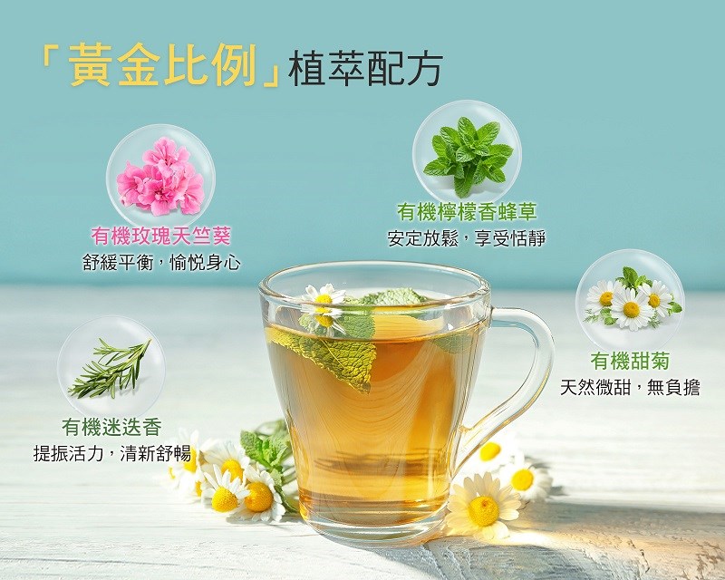 成份:有機德國洋甘菊(台灣)、有機芳香萬壽菊(台灣)、有機綠薄荷(台灣)、有機檸檬香蜂草(台灣)
