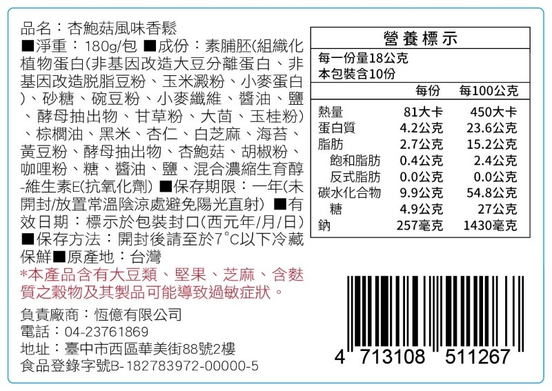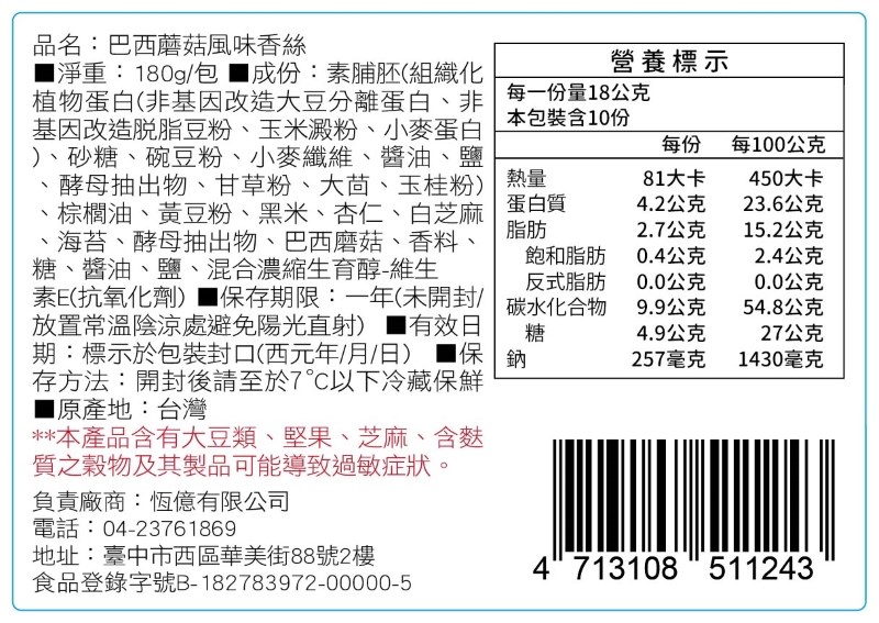 成分:素脯胚(組織化植物蛋白(非基因改造大豆分離蛋白、非基因改造脫脂豆粉、玉米澱粉、小麥蛋白)、砂糖、豌豆粉、小麥纖維、醬油、鹽、酵母抽出物、甘草粉、大茴、玉桂粉)、棕櫚油、黃豆粉、黑米、杏仁、白芝麻、海苔、酵母抽出物、巴西蘑菇、香料、糖、醬油、鹽、混和濃縮生育醇-維生素E(抗氧化劑)
