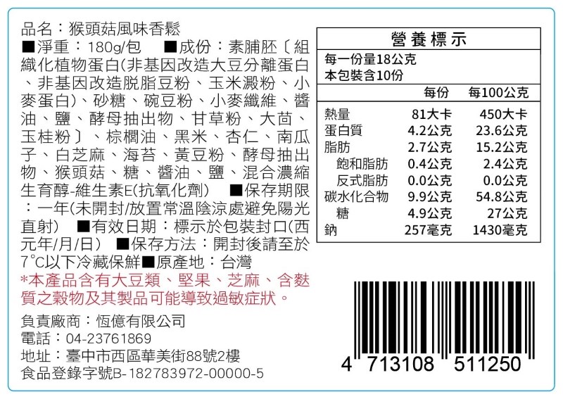 成分:素脯胚(組織化植物蛋白(非基因改造大豆分離蛋白、非基因改造脫脂豆粉、玉米澱粉、小麥蛋白)、砂糖、豌豆粉、小麥纖維、醬油、鹽、酵母抽出物、甘草粉、大茴、玉桂粉)、棕櫚油、黃豆粉(非基因改造)、黑米、杏仁、白芝麻、海苔、香料、猴頭菇、酵母抽取物、糖、醬油、鹽、混和濃縮生育醇(維生素E-抗氧化劑)