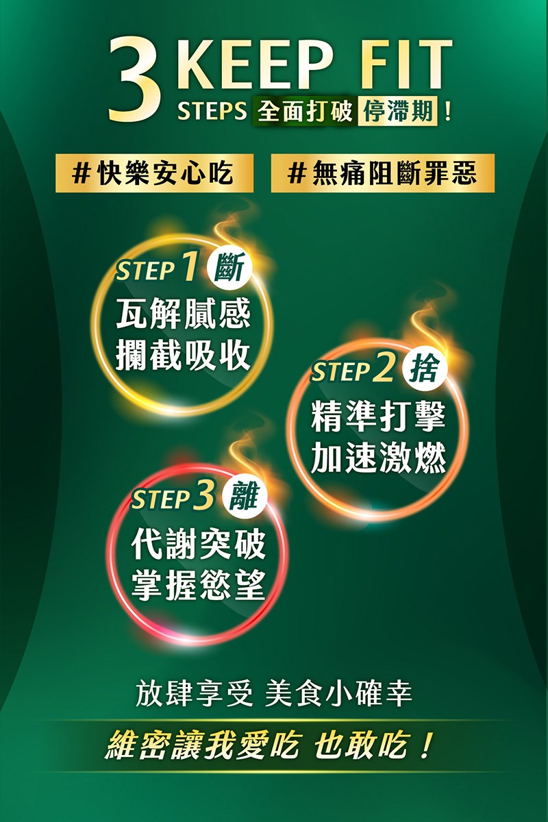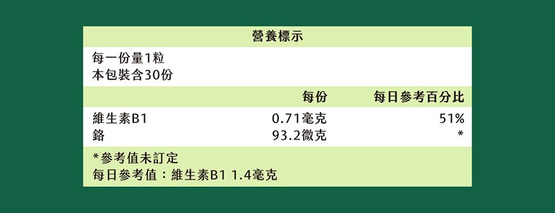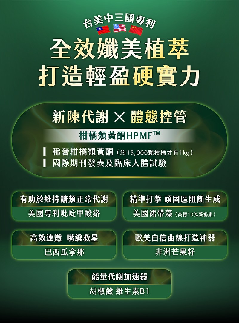 內容物:裙帶菜萃取物(含藻褐素)、柑橘萃取物(含HPMF™)(麥芽糊精、柑橘萃取粉)、麥芽糊精、瓜拿那萃取粉(瓜拿那萃取粉、麥芽糊精)、非洲芒果籽萃取粉(非洲芒果籽萃取粉、麥芽糊精)、微結晶狀α-纖維素、二氧化矽、黑胡椒萃取胡椒鹼、維生素B1 、吡啶甲酸鉻、硬脂酸鎂