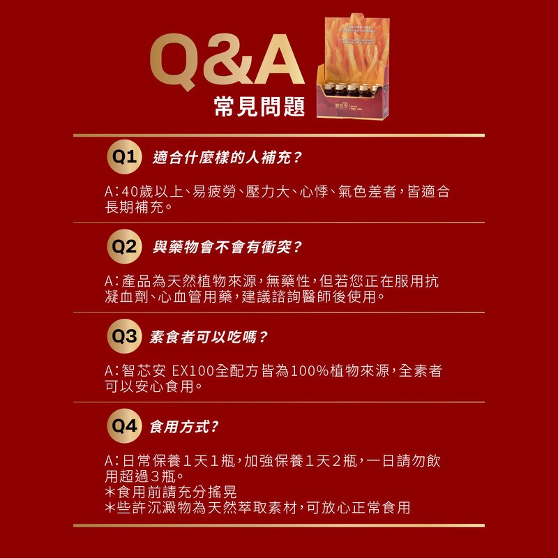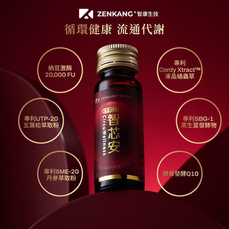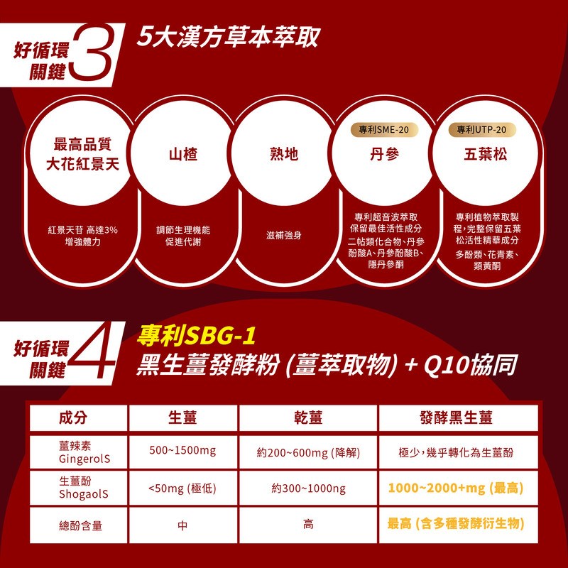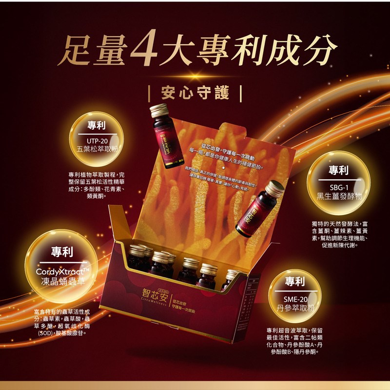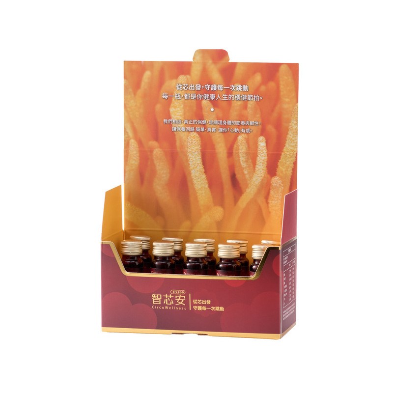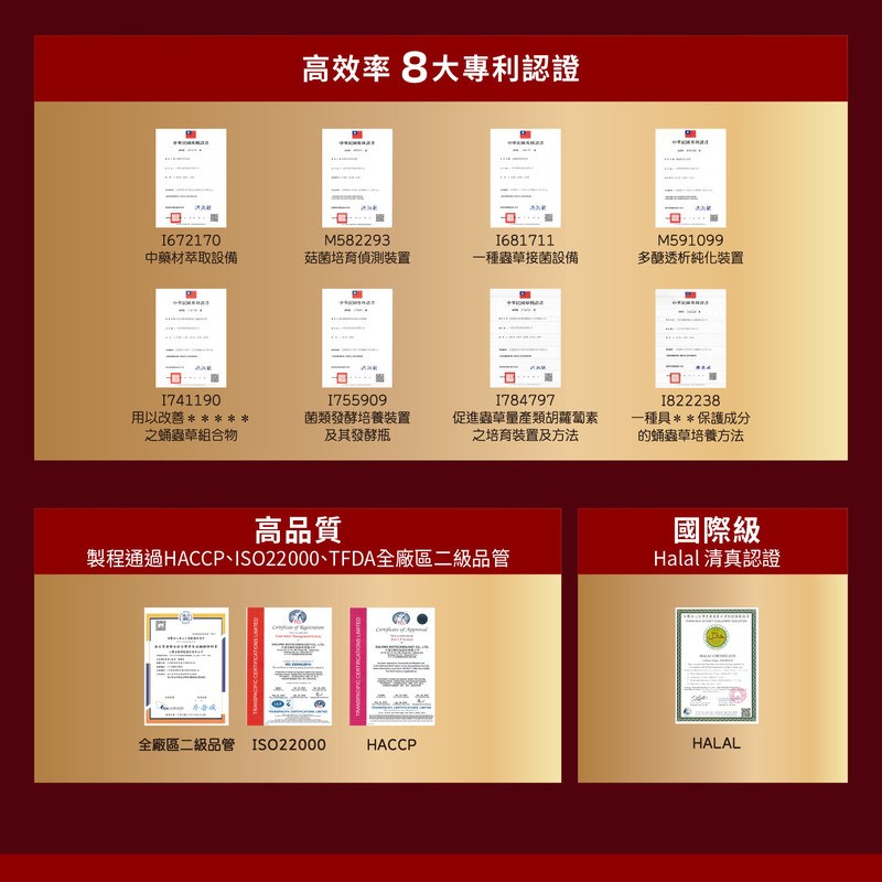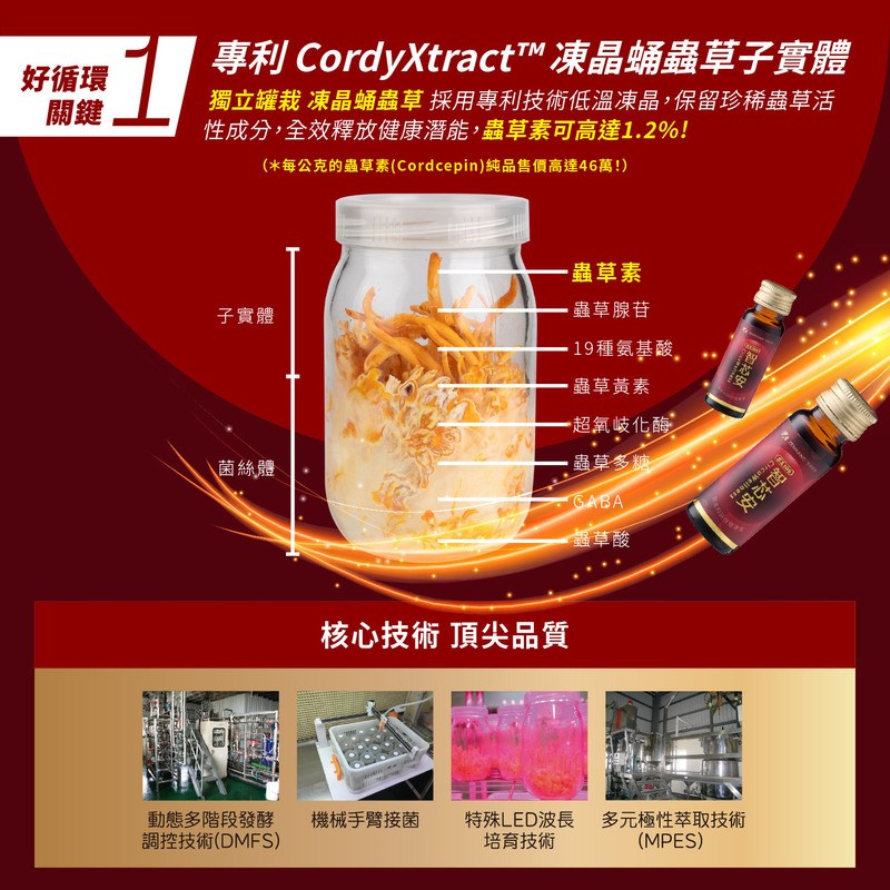 成分:專利凍晶蛹蟲草子實體(Cordyceps militaris,固態醱酵培養)、水、黑棗汁、蘋果汁、羅漢果萃取物、熟地萃取物、紅景天萃取物、黑生薑發酵粉、薑萃取物、山楂萃取物、CoQ10、玉米糖膠、柑橘萃取物(含類黃酮)、五松葉萃取物、納豆萃取物(20000FU)、丹蔘萃取物。