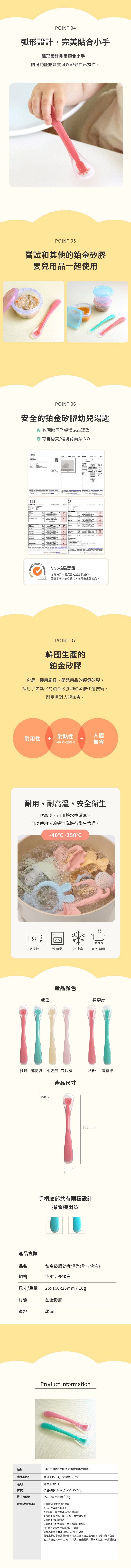 湯匙材質:100%鉑金矽膠 耐冷熱溫度:-40~250°C