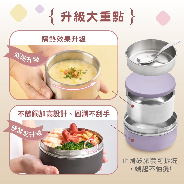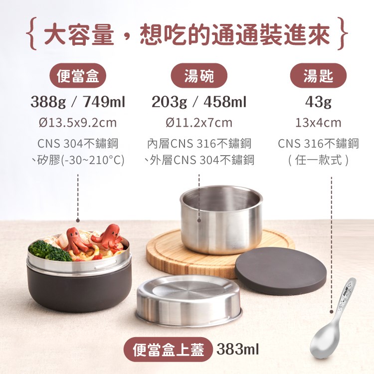 •便當盒選用304不鏽鋼、湯碗選用316不鏽鋼,好洗不易變色、不殘留異味。