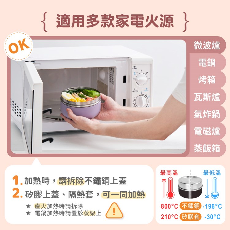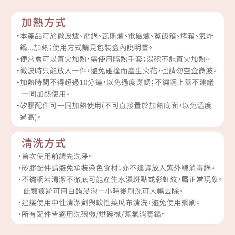 2.為了避免過度烹調,加熱時間不超過10分鐘,不鏽鋼上蓋不建議一同加熱使用,矽膠上蓋、隔熱套可一同加熱使用