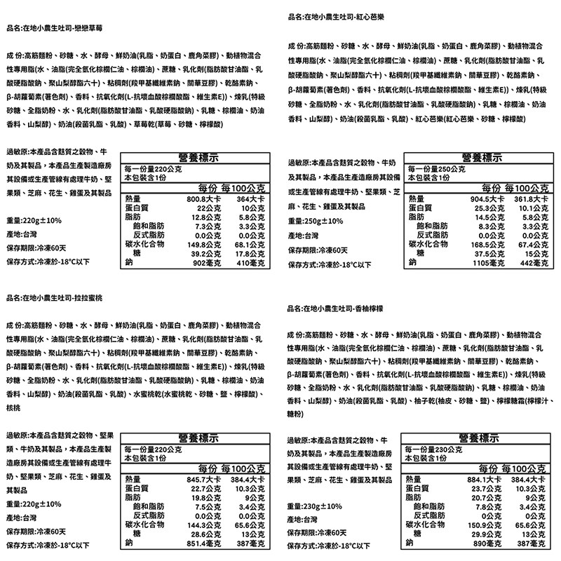 過敏原:本產品含麩質之穀物、雞蛋、牛奶及其製品,本產品生產製造廠房其設備或生產管線有處理牛奶、堅果類、芝麻、花生、雞蛋及其製品