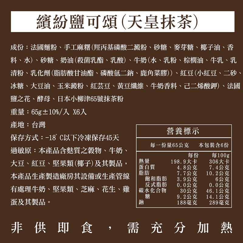 成份 | 法國麵粉、手工麻糬(羥丙基磷酸二澱粉、砂糖、麥芽糖、椰子油、香 料、水)、砂糖、奶油(殺菌乳酯、乳酸)、牛奶(水、乳粉、棕櫚油、牛乳、乳 清粉、乳化劑(脂肪酸甘油酯、磷酸氫二鈉、鹿角菜膠))、紅豆(小紅豆、二砂、冰糖、大豆油、玉米澱粉、紅芸豆、黃豆纖維、牛奶香料、己二烯酸鉀)、法國鹽之花、酵母、日本小柳津65號抹茶粉