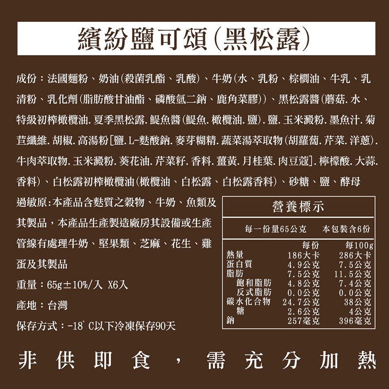 成份 | 法國麵粉、奶油(殺菌乳酯、乳酸)、牛奶(水、乳粉、棕櫚油、牛乳、乳 清粉、乳化劑(脂肪酸甘油酯、磷酸氫二鈉、鹿角菜膠))、黑松露醬(蘑菇.水、 特級初榨橄欖油.夏季黑松露.鯷魚醬(鯷魚.橄欖油.鹽).鹽.玉米澱粉.墨魚汁.菊 苣纖維.胡椒.高湯粉[鹽.L-麩酸鈉.麥芽糊精.蔬菜湯萃取物(胡蘿蔔.芹菜.洋蔥). 牛肉萃取物.玉米澱粉.葵花油.芹菜籽.香料.薑黃.月桂葉.肉豆蔻].檸檬酸.大蒜. 香料)、白松露初榨橄欖油(橄欖油、白松露、白松露香料)、砂糖、鹽、酵母
