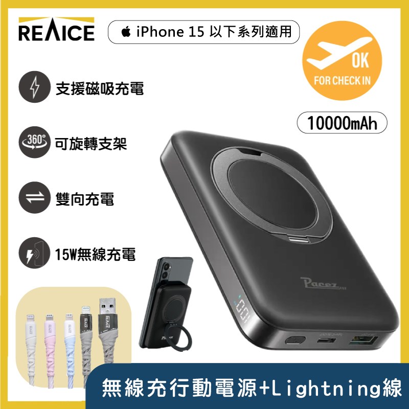 【REAICE】磁吸指環支架數顯無線充行動電源組1萬mAh十Lightning線(PZ-PBM12)