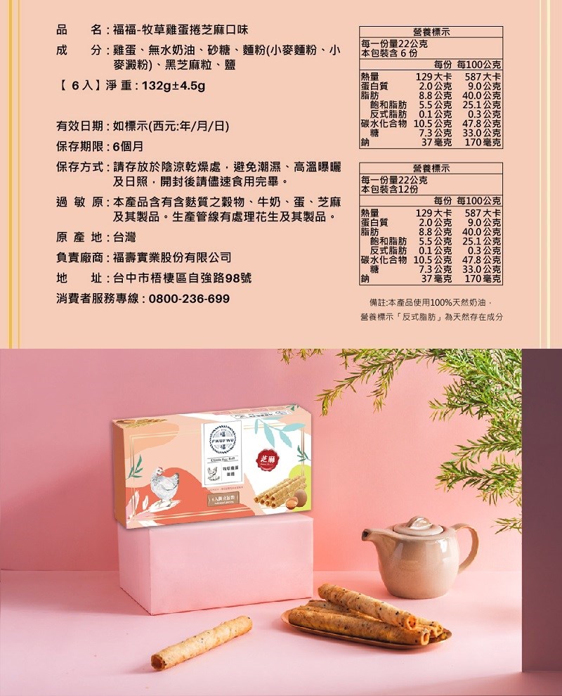 品       名:福福-牧草蛋芝麻蛋捲-6入盒裝 (單支包裝/新鮮、不沾手)