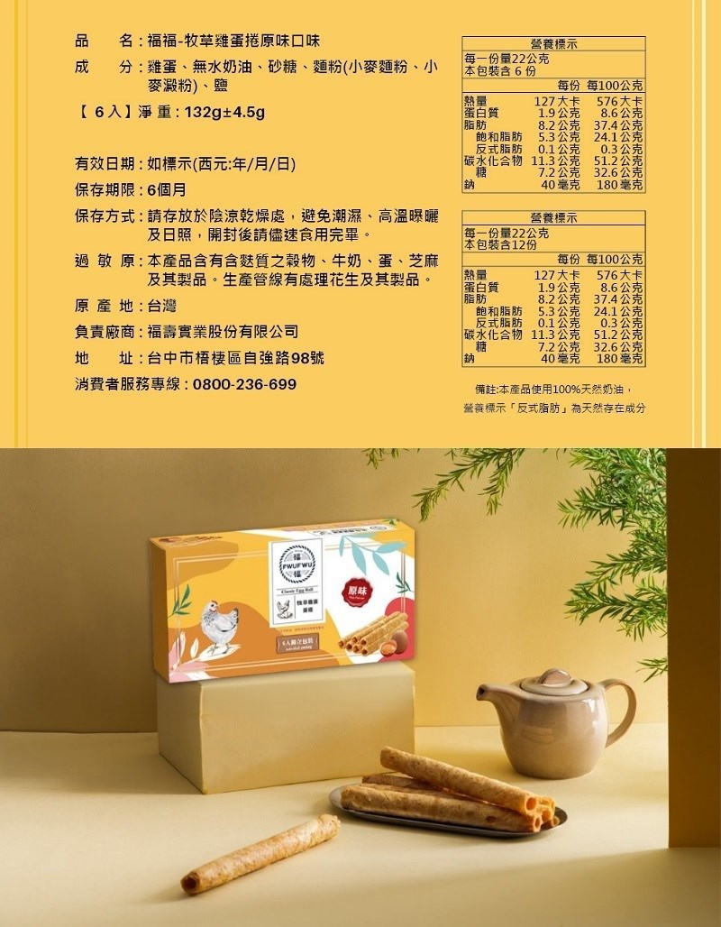 品       名:福福-牧草蛋原味蛋捲-6入盒裝 (單支包裝/新鮮、不沾手)