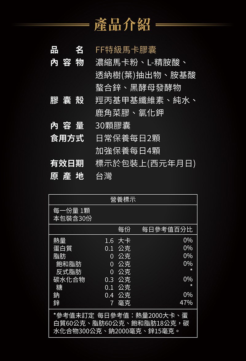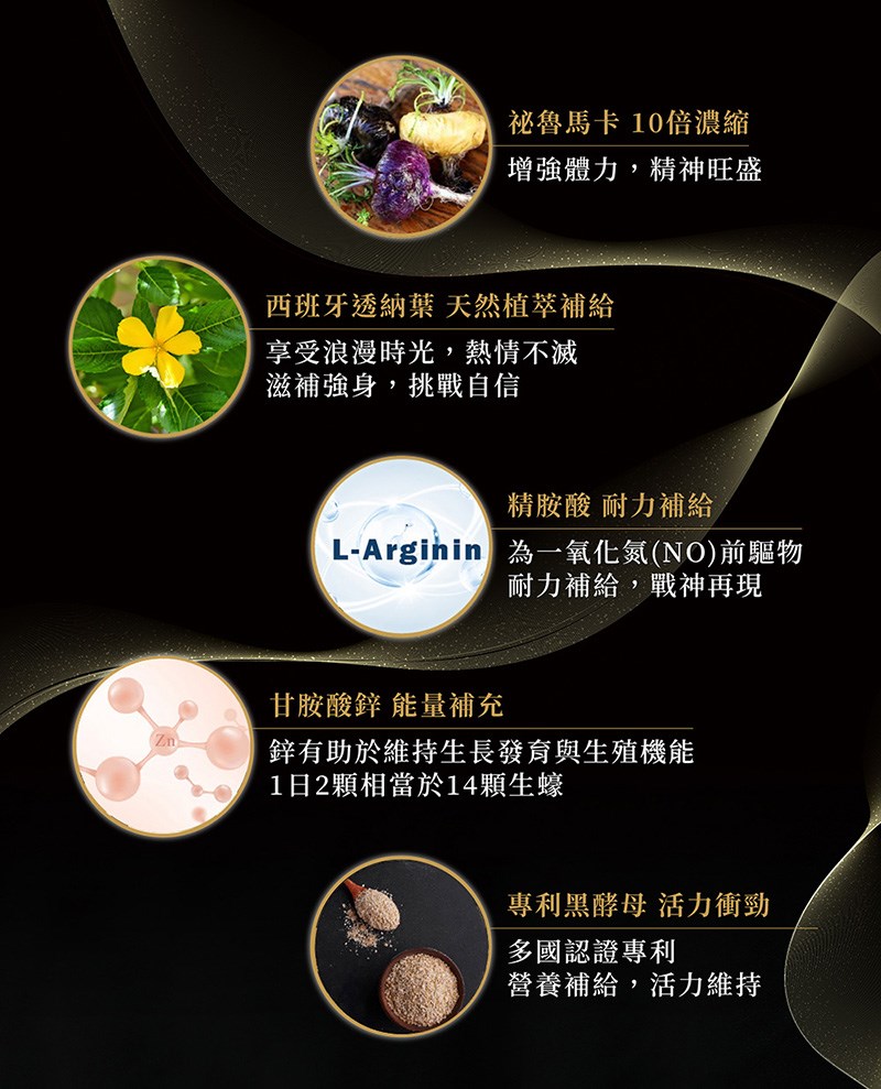 內容物成分:濃縮馬卡粉,L-精胺酸、透納樹(葉)抽出物、胺基酸螯合鋅、黑酵母發酵物