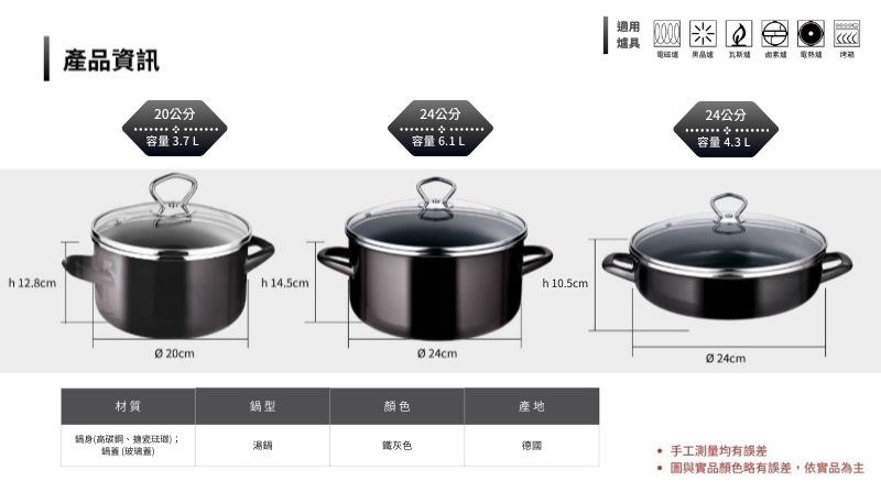 • 適用爐具  :    瓦斯爐,電爐,電陶爐,鹵素爐,電磁爐,IH爐,烤箱
