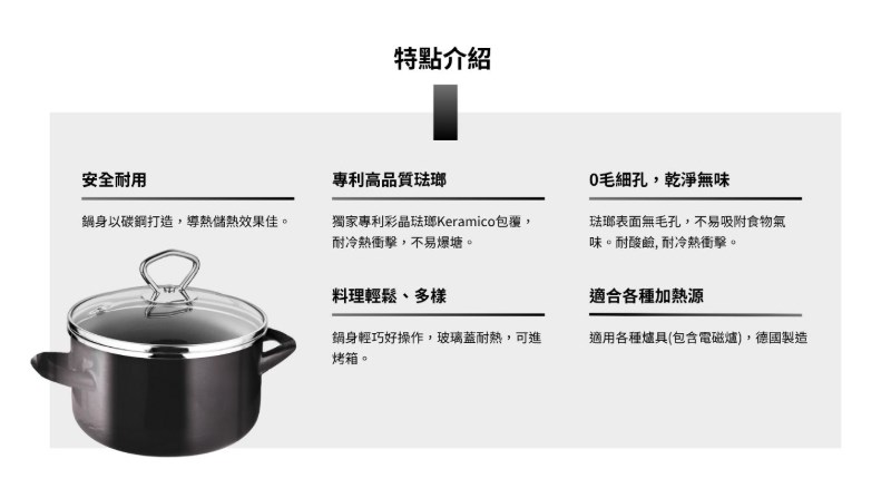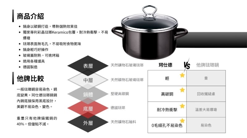 獨家專利彩晶琺瑯Keramico包覆,耐冷熱衝擊,不易爆塘!,