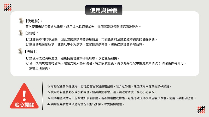 • 材質  :     彩晶琺瑯 ;高碳鋼 ;不鏽鋼  ;玻璃