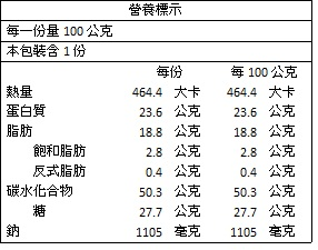 成份: 精選大豆蛋白(非基因改造大豆)、糖、大豆沙拉油(非基因改造大豆)、海苔、芝麻、杏仁、醬油(黃豆(非基因改造黃豆)、小麥、糖)、南瓜、核桃、腰果、酵母抽出物、鹽、黑胡椒粉)