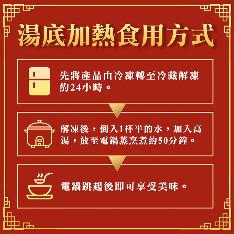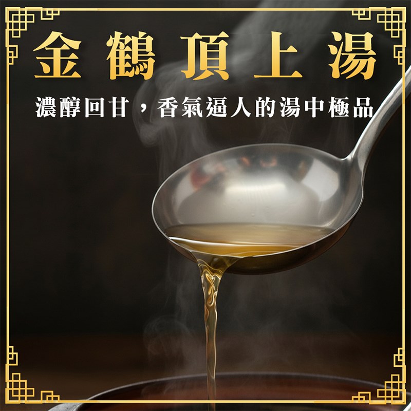 以天然辛香料、老母雞、赤肉、金華火腿熬製而成