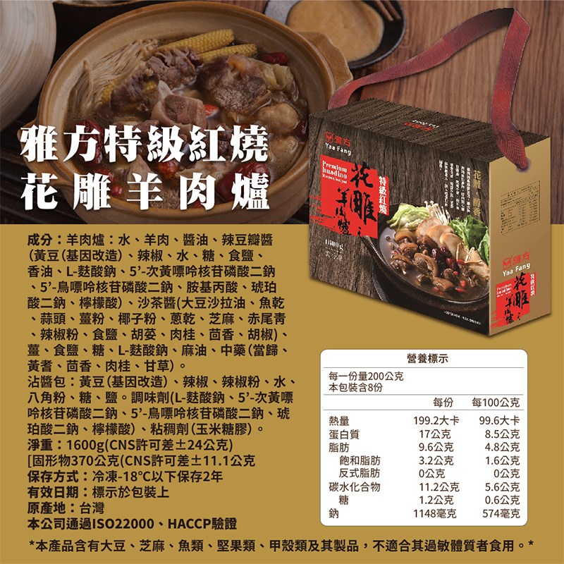 【菊頌坊】秋冬進補首選‧雅方特級紅燒花雕羊肉爐(1600g/盒)
