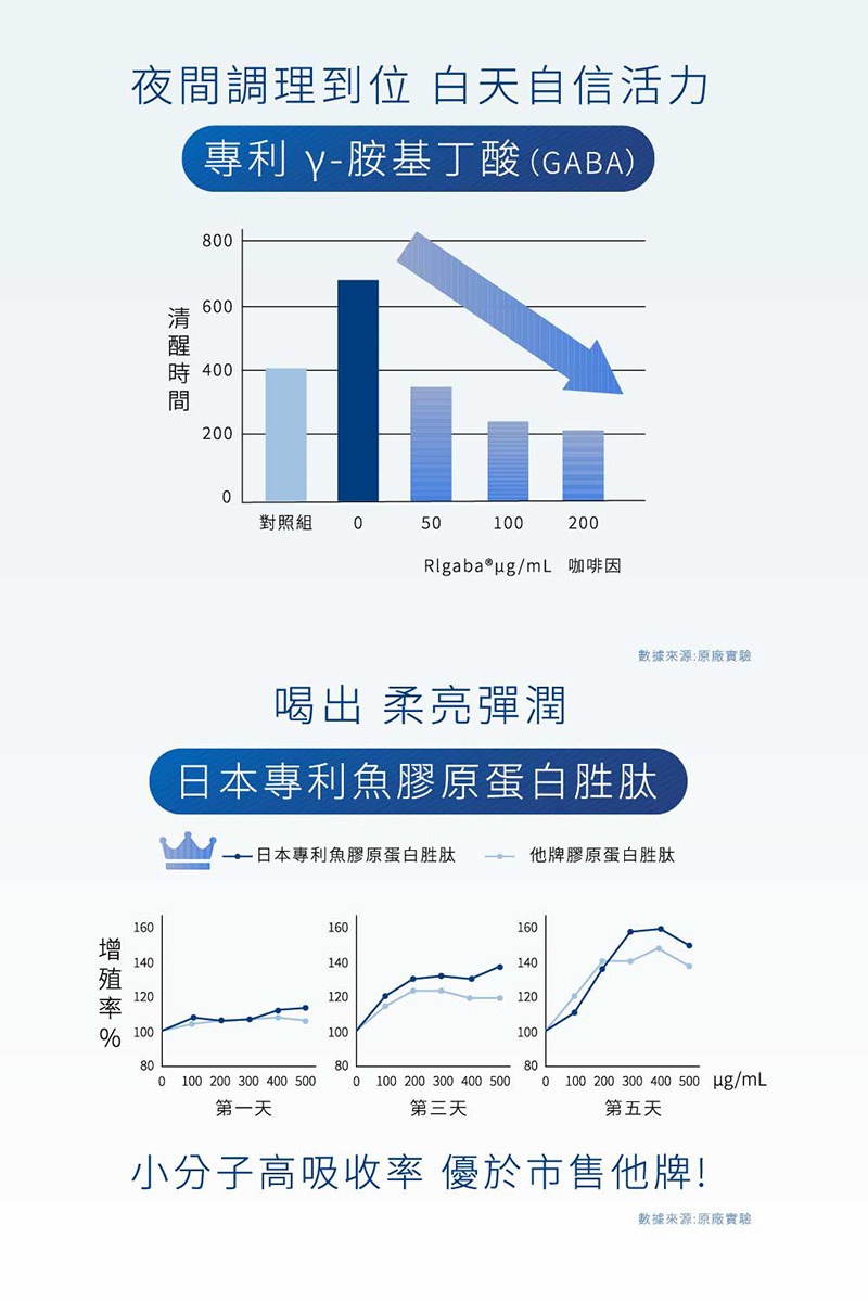 內容物:純水、水蜜桃濃縮汁、韓國專利魚膠原蛋白胜肽、異麥芽寡醣漿、日本專利魚膠原蛋白胜肽、果糖粉、海藻鈣、西印度櫻桃萃取物(含維生素C)(西印度櫻桃萃取物、玉米麥芽糊精)、日本專利蠶絲蛋白(蠶絲蛋白、樹薯糊精)、專利γ-胺基丁酸(GABA)、檸檬酸、日本專利金頂側耳萃取物(γ-環狀糊精、金頂側耳萃取物)、專利石榴萃取物(石榴萃取物、麥芽糊精)、海水濃縮物(鎂)、香料、維生素B6、L-色胺酸、維生素B12