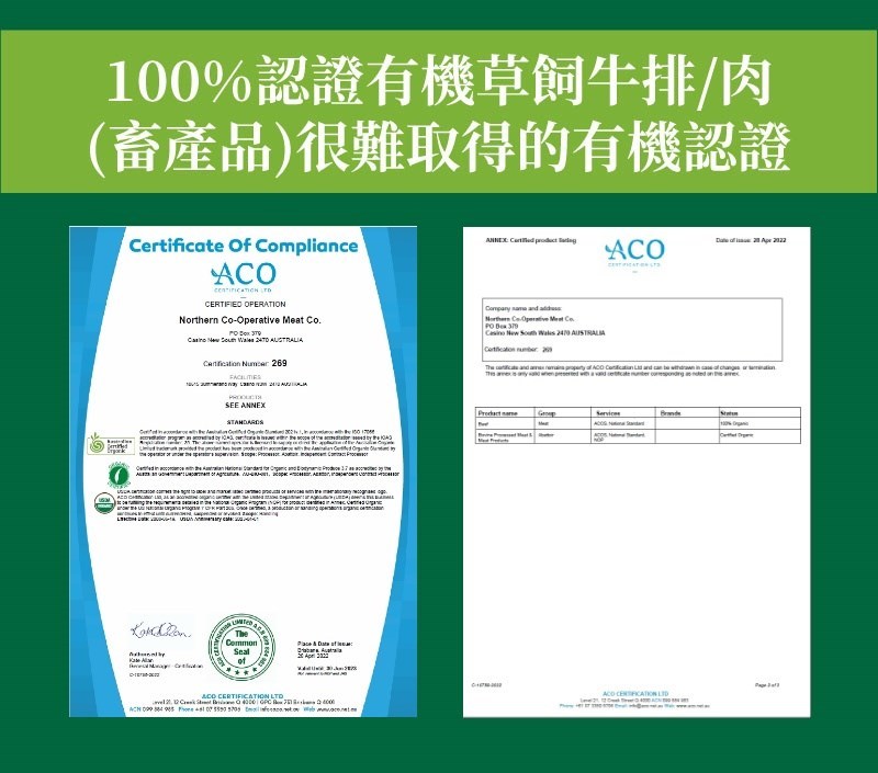 • 產品特色:澳洲ACO認證有機、100%草飼濕式熟成牛小排