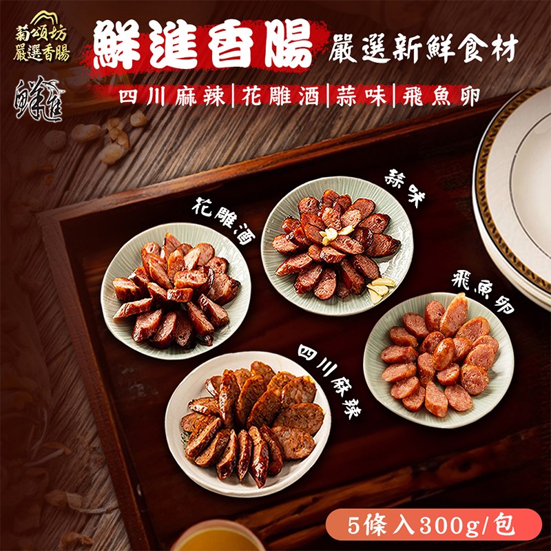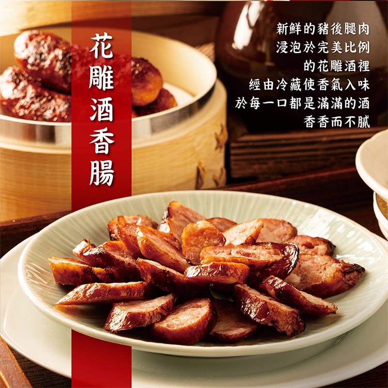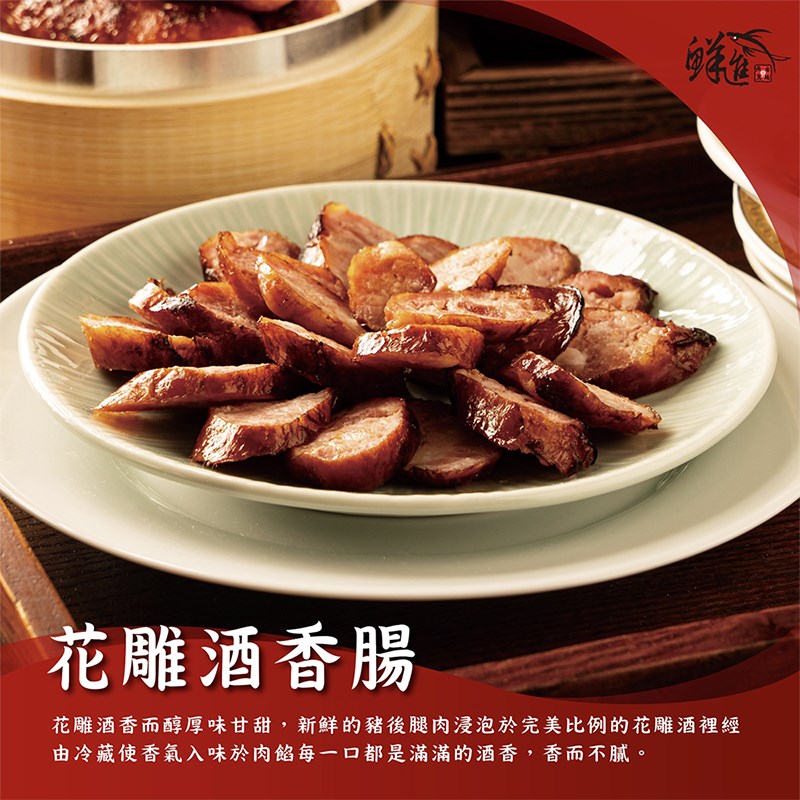 鮮進香腸嚴選上等豬肉,以經典花雕酒入味,細火慢工調製。花雕酒香氣幽雅,酒香滲入肉質纖維,讓香腸入口後,先是濃郁酒香挑動味蕾,隨之而來的是豐潤肉汁與甘醇尾韻。