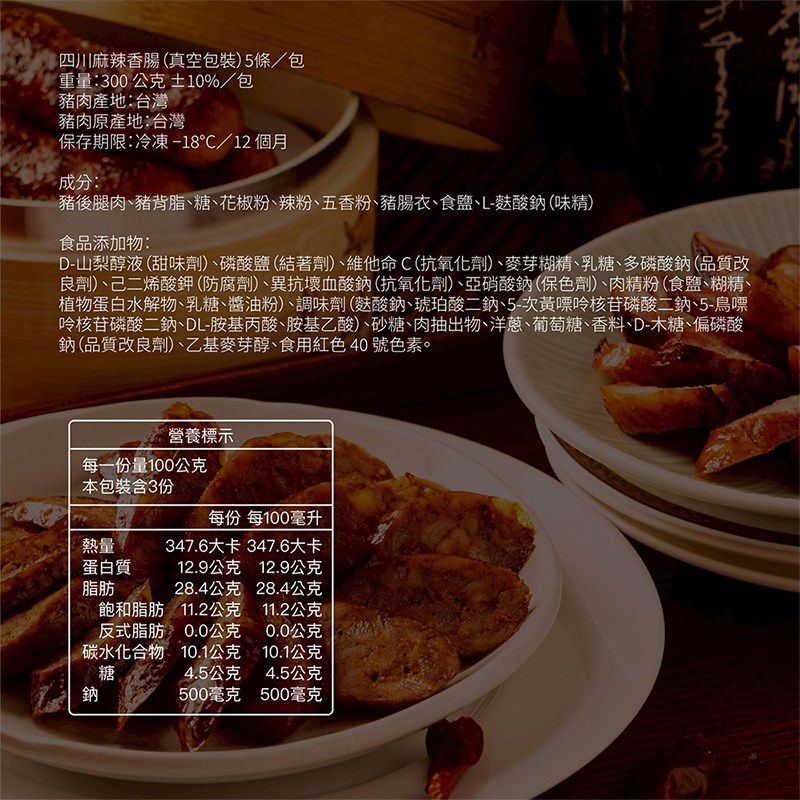 成分:豬後腿肉、豬背脂、糖、花椒粉、辣粉、五香粉、豬腸衣、食鹽、L-麩酸鈉(味精)