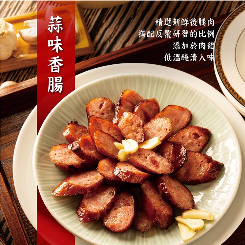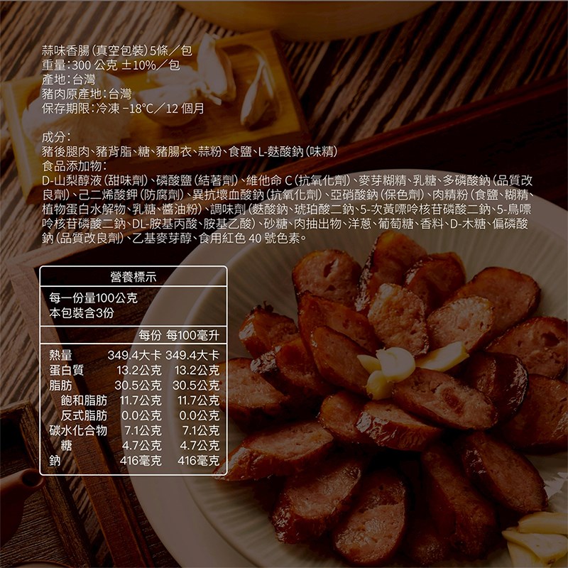 成分:豬後腿肉、豬背脂、糖、豬腸衣、蒜粉、食鹽、L-麩酸鈉(味精)