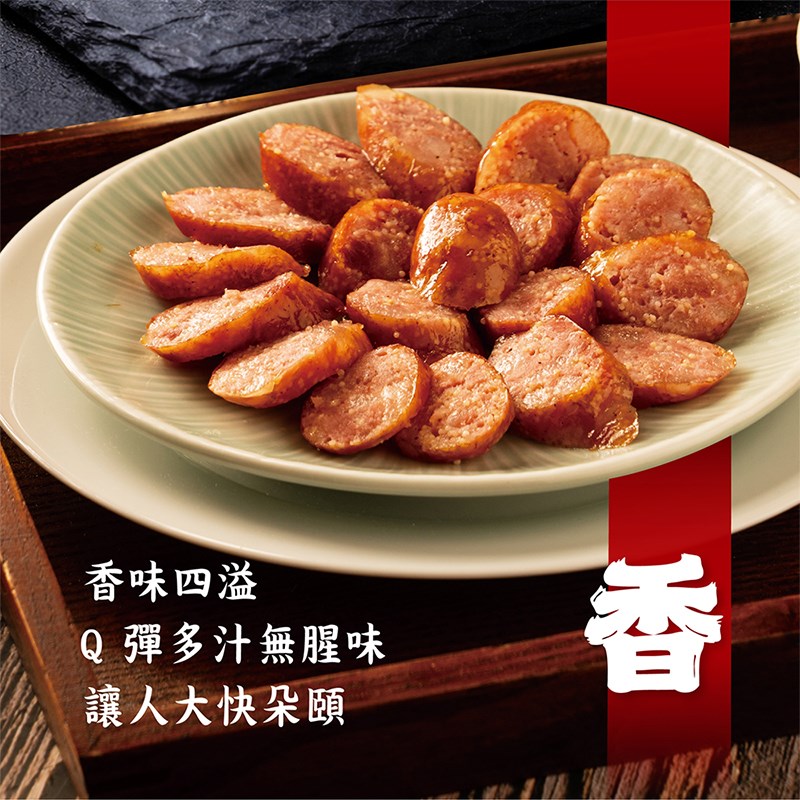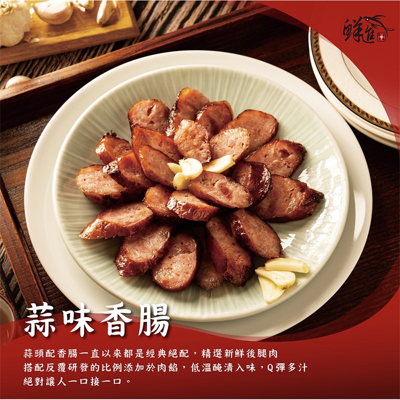 鮮進香腸嚴選新鮮蒜頭與上等豬肉黃金比例製成。蒜頭經細緻調配,讓香氣滲透肉質,入口時蒜香濃郁卻不嗆辣,伴隨肉汁鮮甜,回味清爽甘醇。