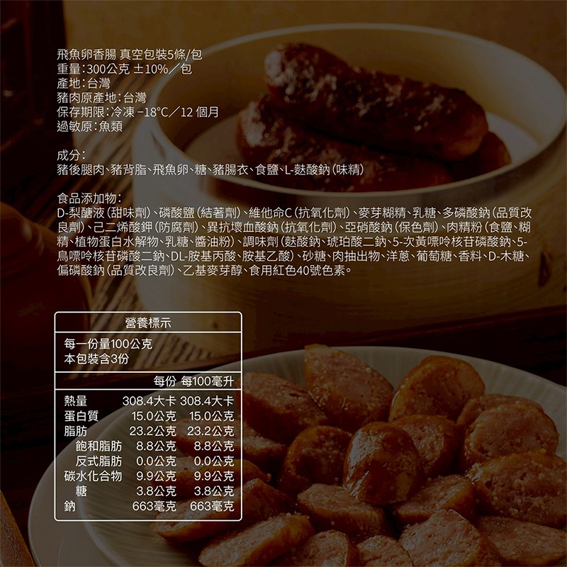 成分:豬後腿肉、豬背脂、飛魚卵、糖、豬腸衣、食鹽、L-麩酸鈉(味精)