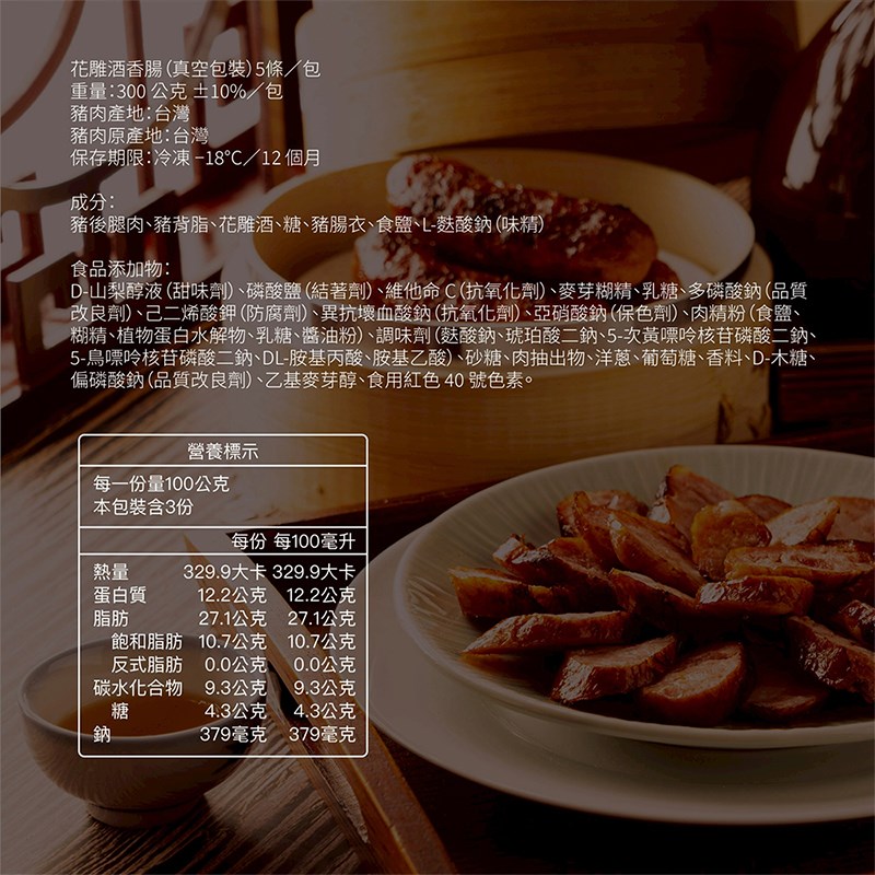 成分:豬後腿肉、豬背脂、花雕酒、糖、豬腸衣、食鹽、L-麩酸鈉(味精)