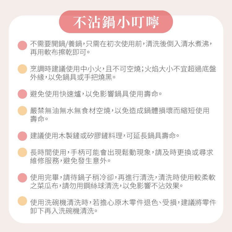 1.鍋內不沾塗層,請使用木餐具或矽膠杓等,不要用鋼絲球清洗。
