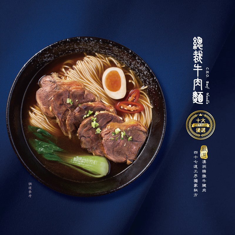 口感描述 :【招牌總裁牛肉麵湯頭以牛骨、豬骨、雞骨等28種食材、熬製八小時而成,主廚精心挑選澳洲1.5公分厚度的牛前腿花腱(即牛腱),筋多且肉質鮮嫩且含豐富膠質,讓牛腱心吸收鍋氣及入味後,再搭配嚴選台南關廟手工製作Q彈麵條,最後淬煉而成招牌總裁私房牛肉麵,微辣的香麻滋味令人胃口大開。