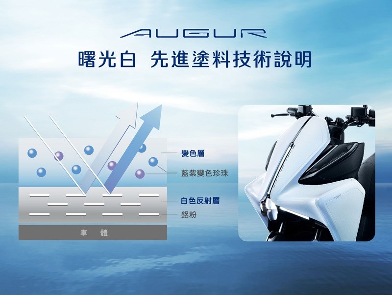 「匠心工藝淬鍊,猶如金屬質感的珠光材質,在純粹的白中透出藍紫幻色,不僅享受智性騎乘體驗,更展現你智慧而獨特的美感品味