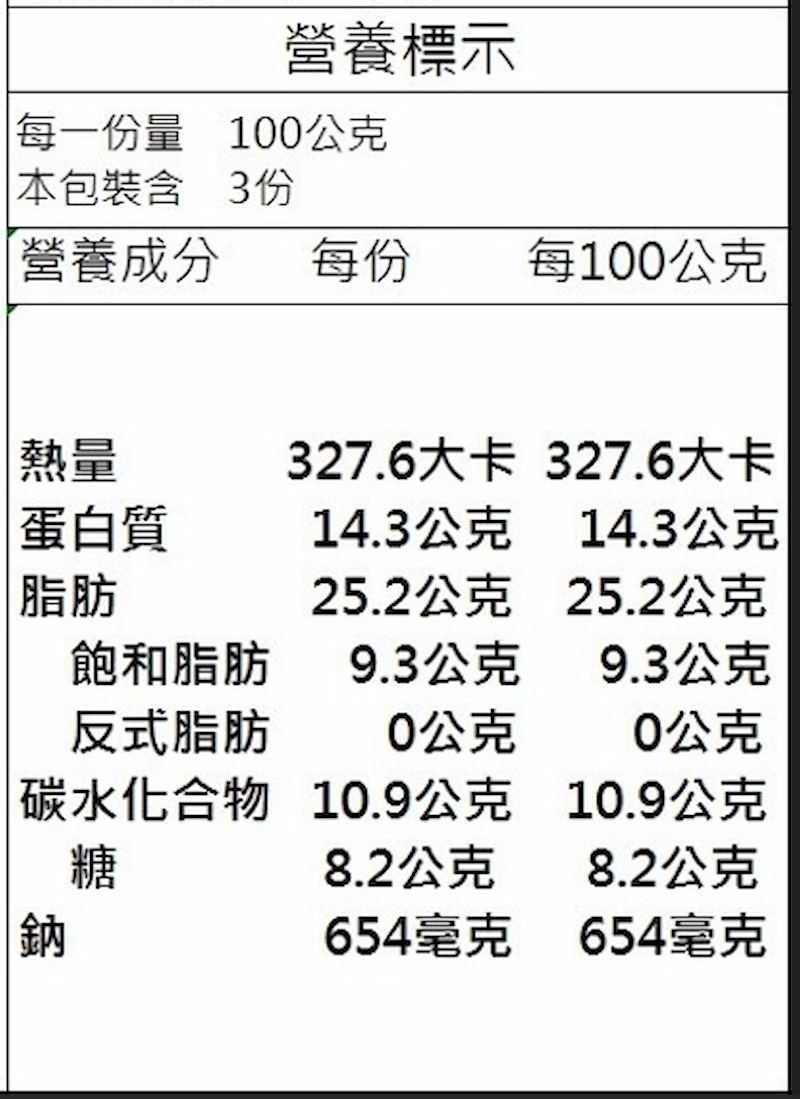 成分:豬前腿胸肉(台灣)、豬油(台灣)、飛魚卵、豬腸衣(西班牙)、糖、鹽、味素(L-麩酸鈉)、辛香料(八角、桂子、肉桂、小茴、花椒、丁香、三奈、甘松、陳皮、甘草、草果、桂枝、百草粉)、胡椒粒、米酒、修飾澱粉(磷酸二澱粉)、美麗紅P(亞硝酸鈉、硝酸鈉、氯化鈉)、益鮮寶(無水醋酸鈉、胺基乙酸、酸性焦磷酸鈉)