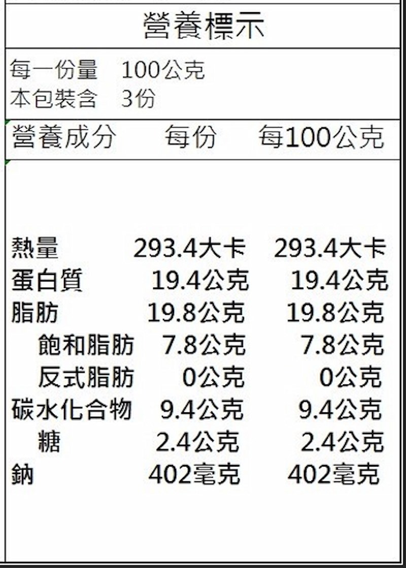 成分:豬前腿胸肉(台灣)、黑鮪魚、豬油(台灣)、豬腸衣(西班牙)、糖、鹽、味素(L-麩酸鈉)、椒香麻辣粉(辣椒、調味劑(L-麩酸鈉)、花椒、鹽、酵母抽出物、薑、蒜、洋蔥、大茴、肉桂、麥芽糊精、非基因改造黃豆、小麥、醬油、糖、麻油、品質改良劑(二氧化矽))、香味佳(葡萄糖、乙基麥芽醇、甲基環戊烯醇酮)、修飾澱粉(磷酸二澱粉)、58度高粱酒、米酒、美麗紅P(亞硝酸鈉、硝酸鈉、氯化鈉)、益鮮寶(無水醋酸鈉、胺基乙酸、酸性焦磷酸鈉)