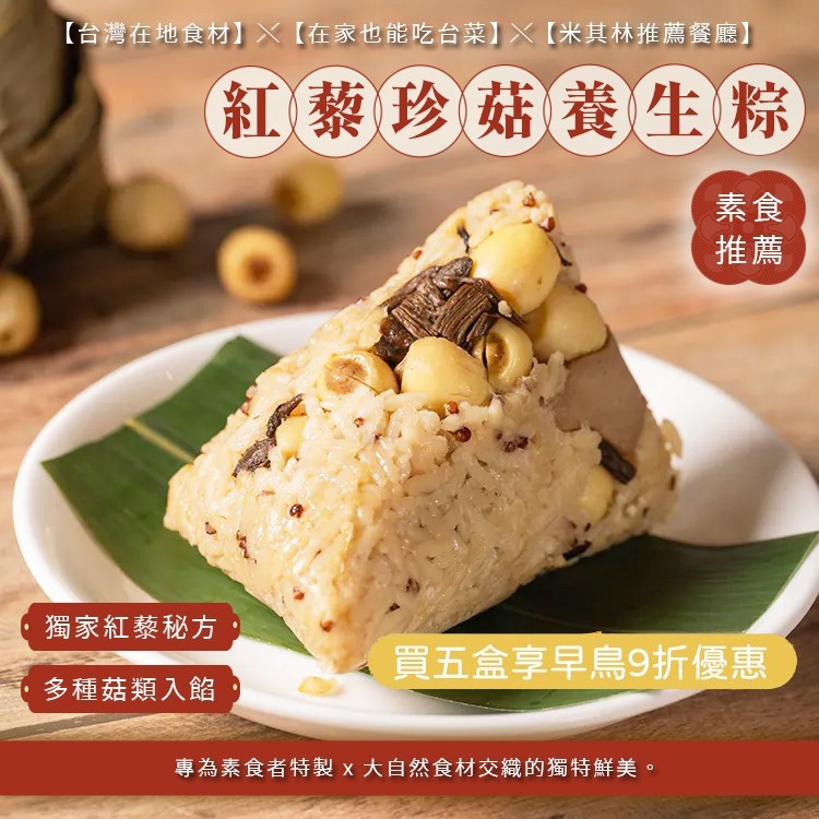 這款素粽也是蘋果日報評比推薦粽子之一,採用精心挑選優質的糯米,再加入紅藜獨家調味,每一粒米粒都經過手工炒製至半熟,散發出誘人的香氣,而餡料更是別出心裁,我們精心挑選台灣在地優質紅藜、香菇、杏鮑菇、茶樹菇等各式菇類,並加入飽滿的蓮子,口感豐富有層次,讓您在端午節享受道地美味的同時,也照顧到了健康。