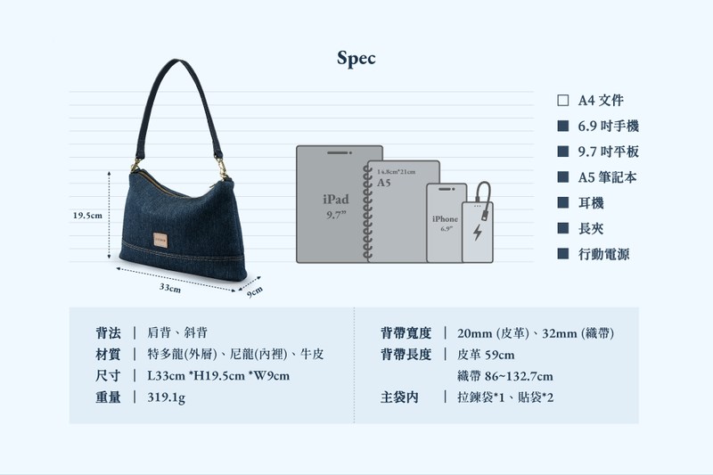 材質:特多龍(外層)、尼龍(內裡)、牛皮