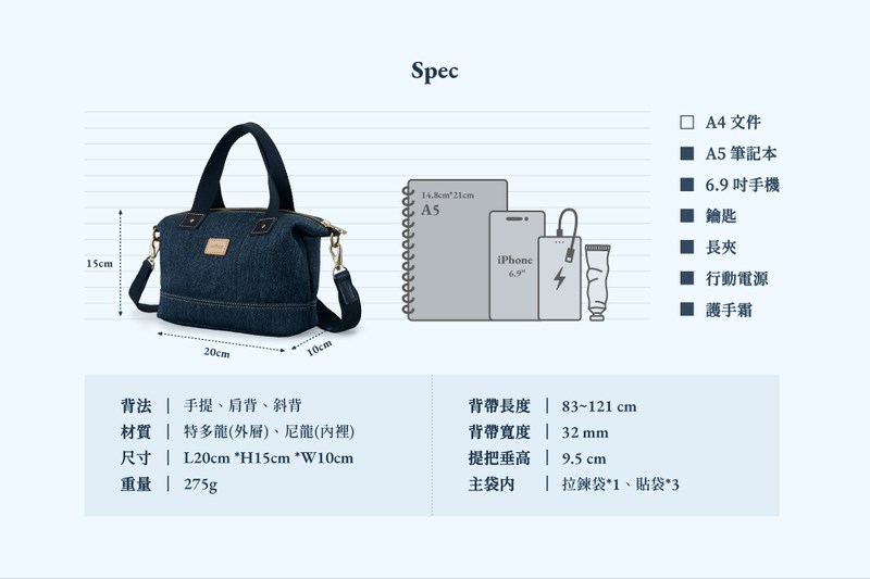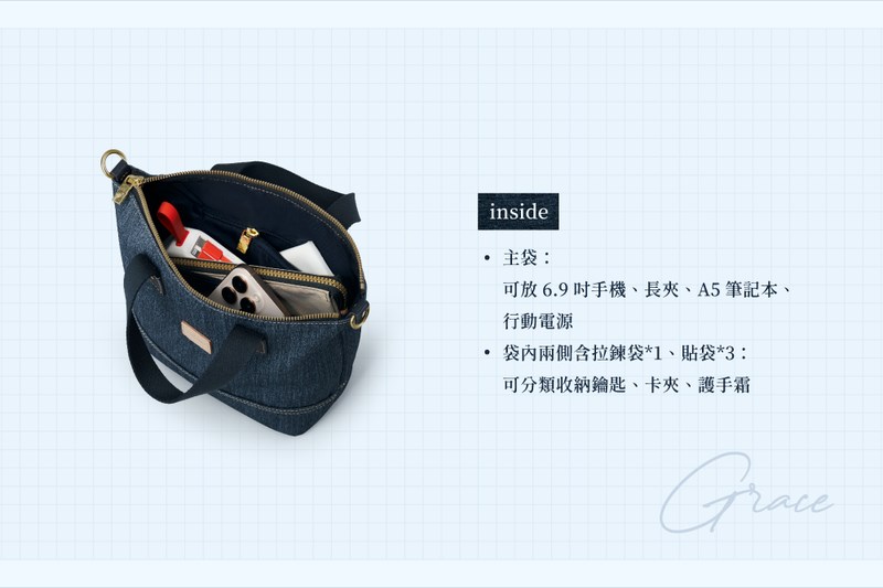 - 拉鍊開口主袋:可放A5筆記本、長夾、6.9吋手機;