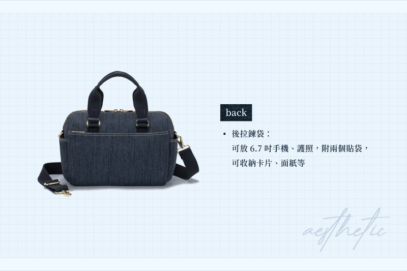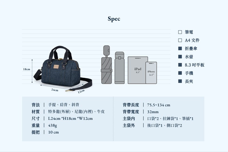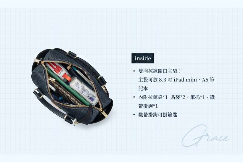 - 雙向拉鍊開口主袋:可放8.3吋iPad mini及A5筆記本。內附1個拉鍊袋、2個貼袋、1個筆插、織帶掛鉤x1