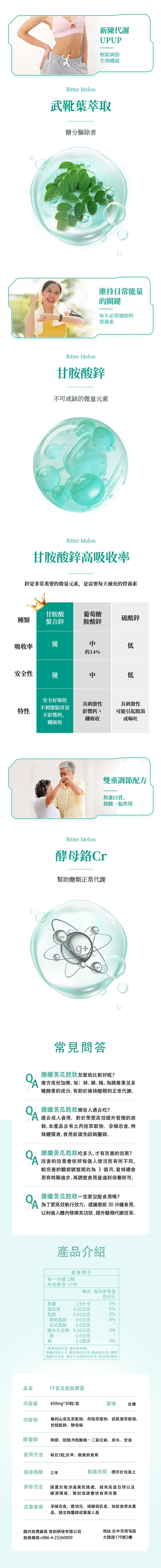 內容物: 專利山苦瓜萃取物、肉桂萃取物、武靴葉萃取物、甘胺酸鋅、酵母鉻