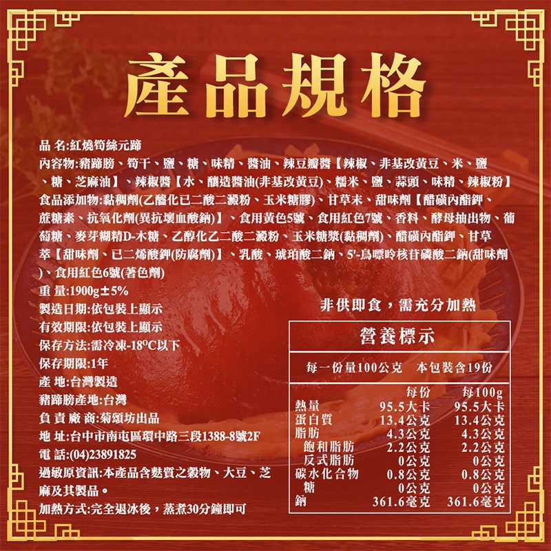 內容物:豬蹄膀、筍干、鹽、糖、味精、醬油、辣豆瓣醬【辣椒、非基改黃豆、米、鹽 、糖、芝麻油】、辣椒醬【水、釀造醬油(非基改黃豆)、糯米、鹽、蒜頭、味精、辣椒粉】 食品添加物:黏稠劑(乙醯化已二酸二澱粉、玉米糖膠)、甘草末、甜味劑【醋磺內酯鉀、 蔗糖素、抗氧化劑(異抗壞血酸鈉)】、食用黃色5號、食用紅色7號、香料、酵母抽出物、葡 萄糖、麥芽糊精D-木糖、乙醇化乙二酸二澱粉、玉米糖漿(黏稠劑)、醋磺內酯鉀、甘草萃【甜味劑、已二烯酸鉀(防腐劑)】、乳酸、琥珀酸二鈉、5'-鳥嘌呤核苷磷酸二鈉(甜味劑 )、食用紅色6號(著色劑)