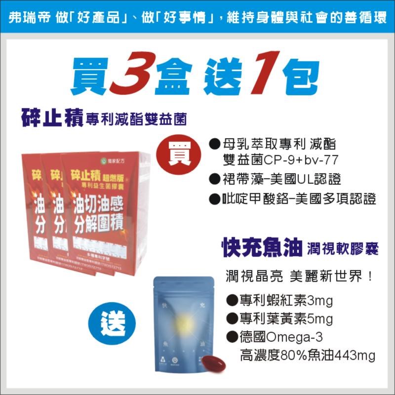 組合內容:碎止積超燃版專利 益生菌膠囊(奶素)30顆/盒,買三送一 (快充魚油40顆/包)