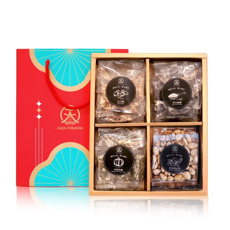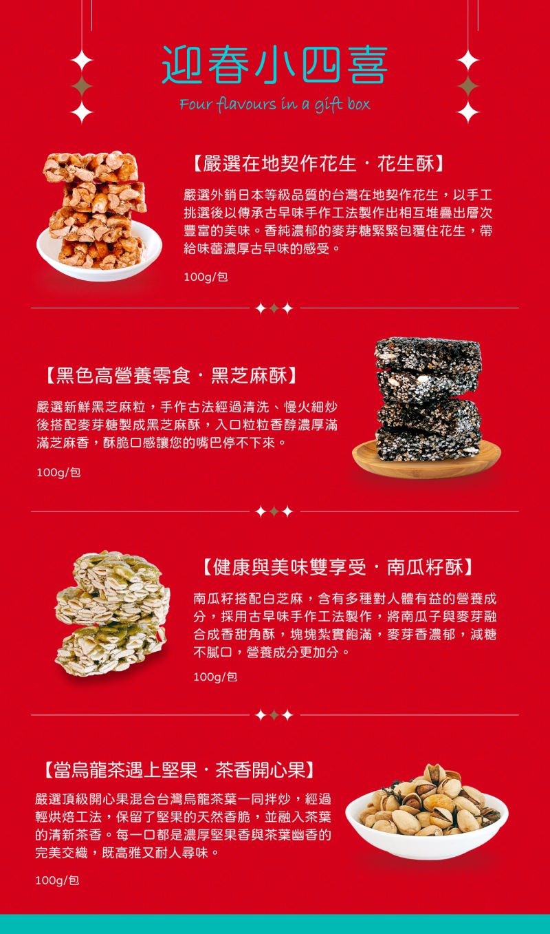 內容物:花生酥(100g/包)x1、芝麻酥(100g/包)x1、南瓜籽酥(100g/包)x1、茶香開心果(100g/包)x1