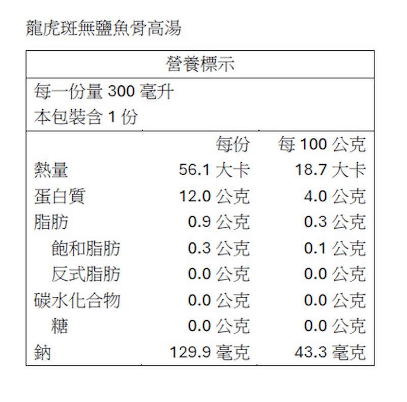 商品名稱 : 龍虎斑無鹽魚骨高湯-20入組