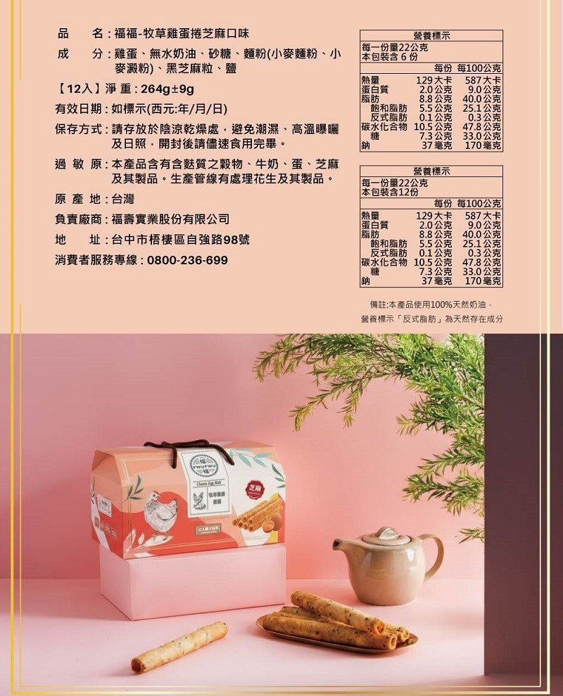 品       名:福福-牧草蛋芝麻蛋捲-12入盒裝 (單支包裝/新鮮、不沾手)