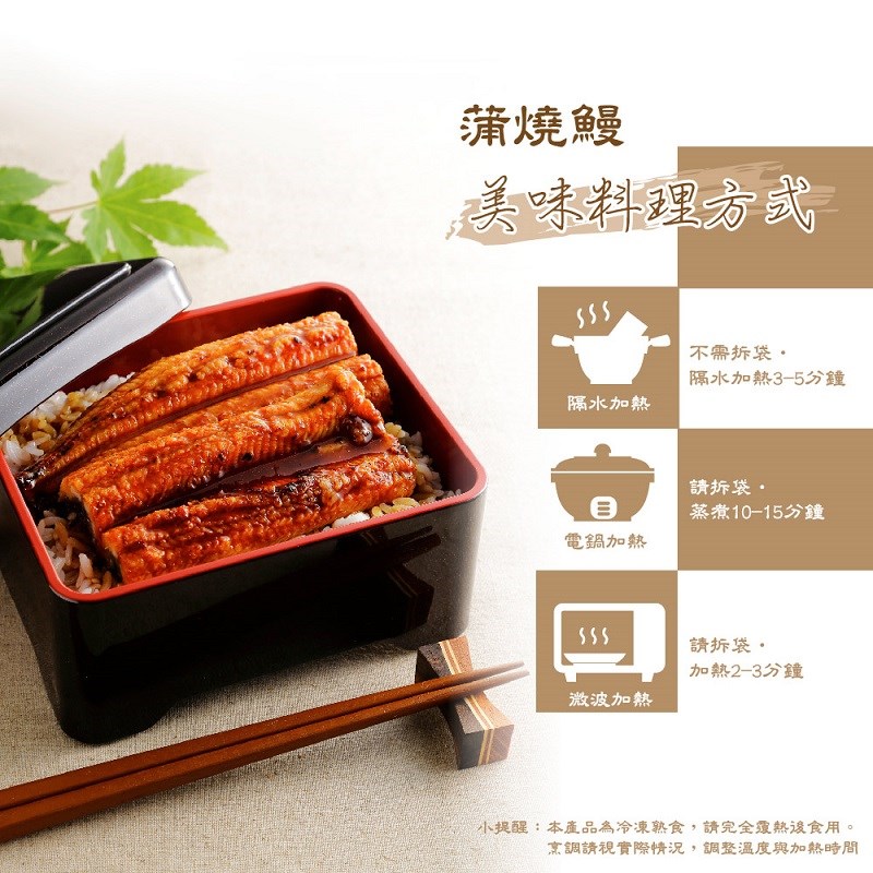 3. 烤箱:解凍後,將鰻魚置於烤爐中,以攝氏150度烤約 3-5分鐘後即可食用。
