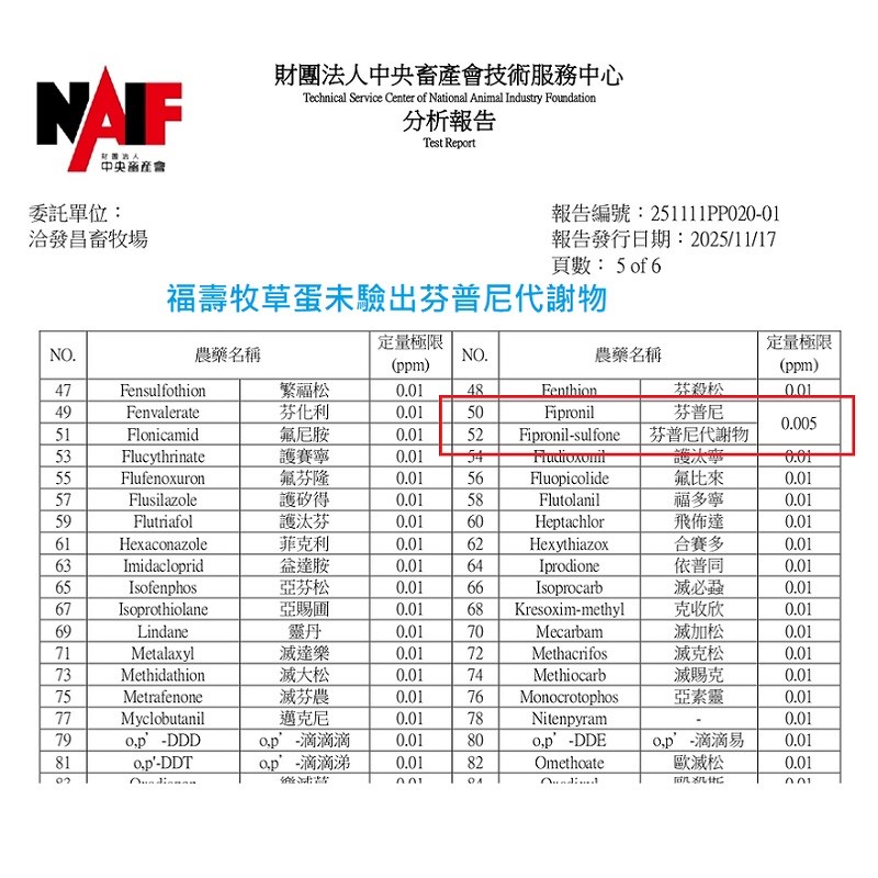 6入裝x12盒(72顆加贈6顆)經第三方公正單位檢驗鮮蛋的 129項農藥殘留,檢驗報告結果為「未檢出任何農藥(含芬普尼)」