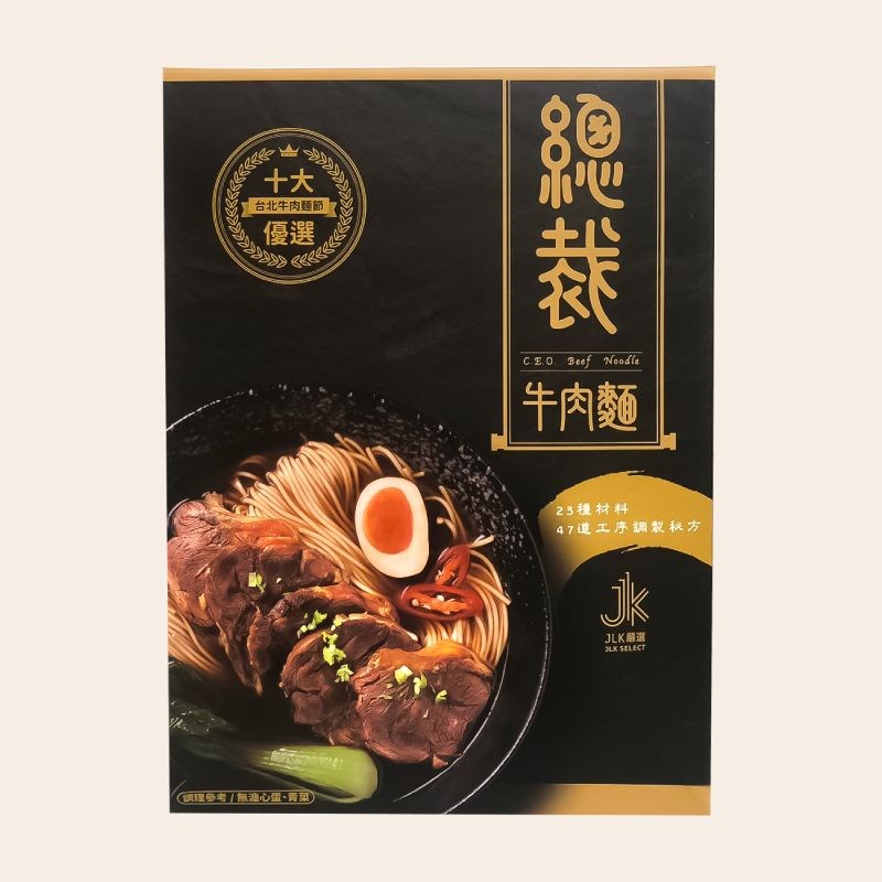 口感描述 :【招牌總裁牛肉麵湯頭以牛骨、豬骨、雞骨等28種食材、熬製八小時而成,主廚精心挑選澳洲1.5公分厚度的牛前腿花腱(即牛腱),筋多且肉質鮮嫩且含豐富膠質,讓牛腱心吸收鍋氣及入味後,再搭配嚴選台南關廟手工製作Q彈麵條,最後淬煉而成招牌總裁私房牛肉麵,微辣的香麻滋味令人胃口大開。】