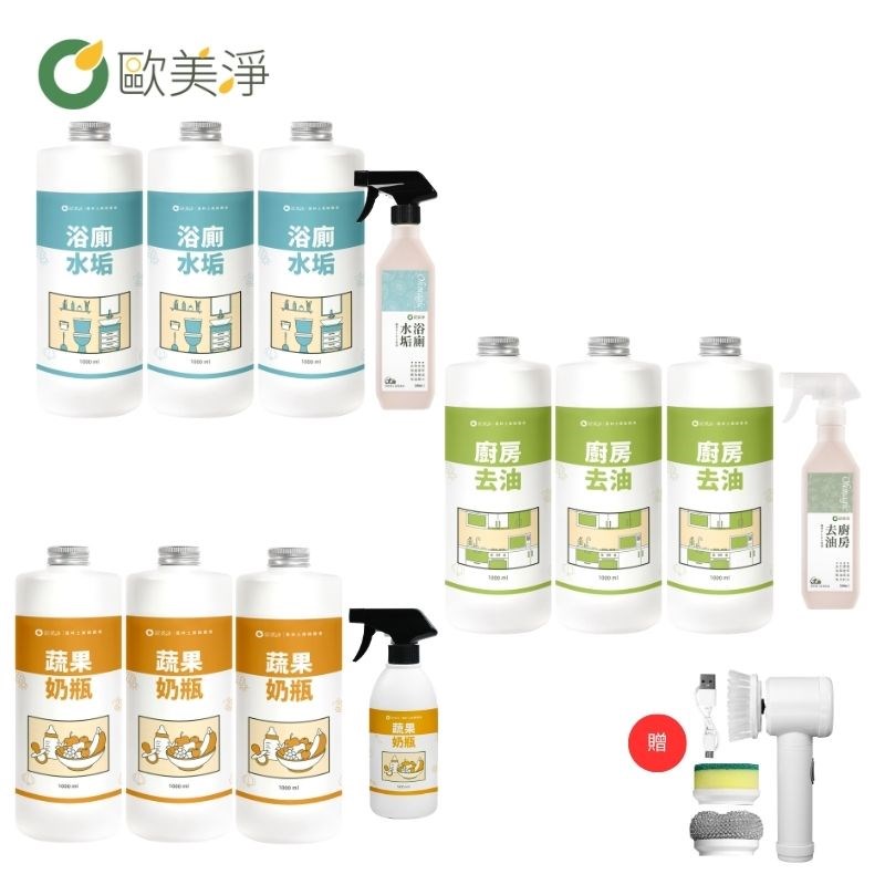 【歐美淨】【清潔劑補充組】500MLx1+1000MLx3(廚房/水垢/蔬果三款可選)贈電動清潔刷